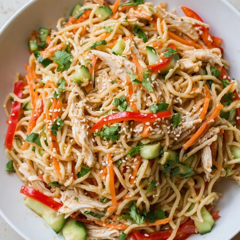 Save There's something magical about the moment a cold noodle salad comes together on a sweltering afternoon—when you're standing in front of an open fridge wondering what to make, and suddenly all the pieces click into place. I discovered this sesame chicken noodle salad during one of those kitchen experiments where I had leftover chicken, a bunch of vegetables that needed rescuing, and just enough curiosity to throw together a dressing from pantry staples. The first bite was a revelation: the warm earthiness of sesame oil against cool noodles, the snap of fresh vegetables, and that perfect salty-sweet balance that made me immediately think about making it again.