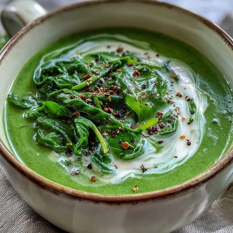 Save This velvety, creamy spinach soup is a celebration of fresh greens and aromatic vegetables. It is a comforting dish that balances the earthiness of spinach with a touch of heavy cream and subtle nutmeg, making it an ideal choice for a light starter or a wholesome, warming lunch.
