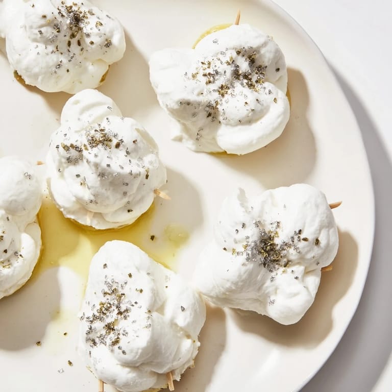 - Fluffy Cheese Clouds: 200 g (7 oz) whipped cream cheese, 100 g (3.5 oz) fresh ricotta, 2 tbsp crème fraîche, ¼ tsp salt, Edible silver or pearl sprinkles (optional, for garnish)