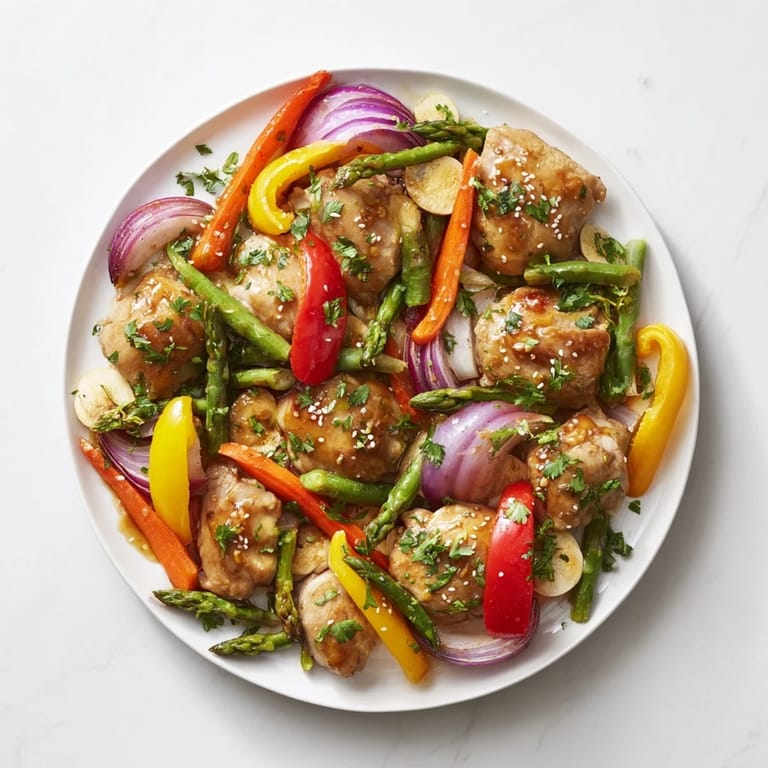 My sister was visiting last spring when I first made this for a crowd. We had spent the day hiking and came back absolutely starving but unwilling to order food again. I threw whatever vegetables we had on a sheet pan with that honey garlic mixture, and honestly I have never seen four people go so quiet so quickly. The way the natural sugars in the bell peppers concentrate in the heat while the chicken gets those crispy edges still makes me think of that rainy afternoon.