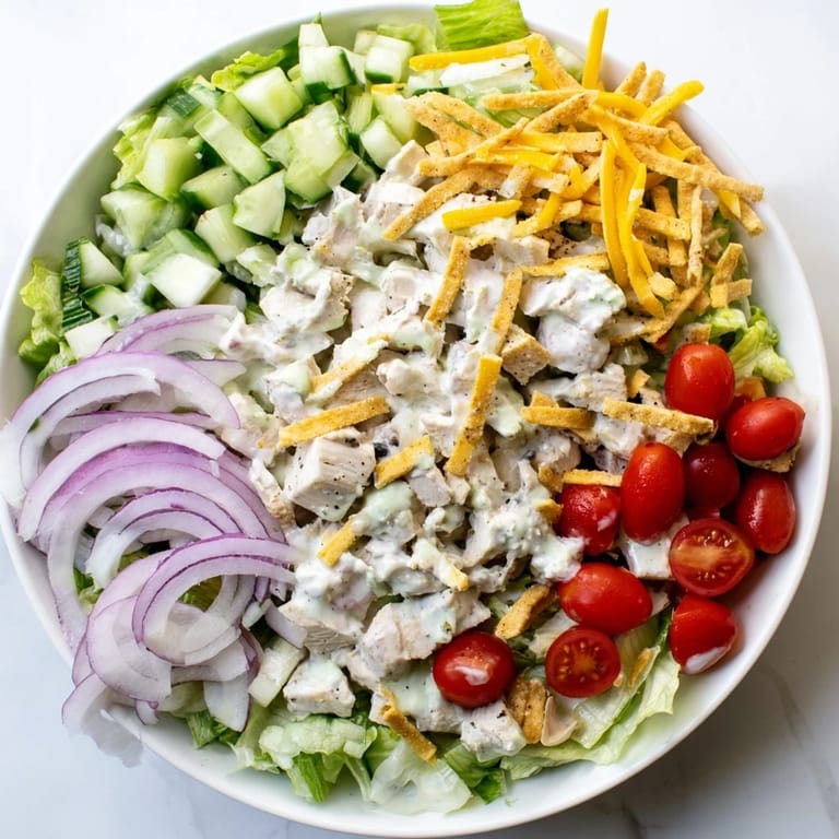 - Add the warm chopped chicken over the crisp vegetables. Drizzle with that jalapeño ranch dressing generously and toss until everything is coated. Top with crispy tortilla strips if you want that extra crunch factor.