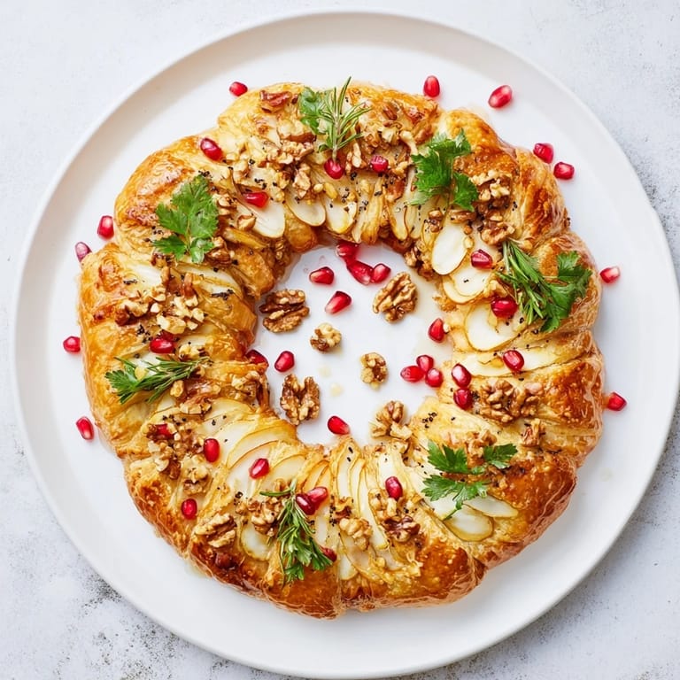 Save A stunning, elegant appetizer featuring creamy Brie, fresh pomegranate seeds, and aromatic herbs arranged in a festive, edible wreath—perfect for holiday entertaining.
