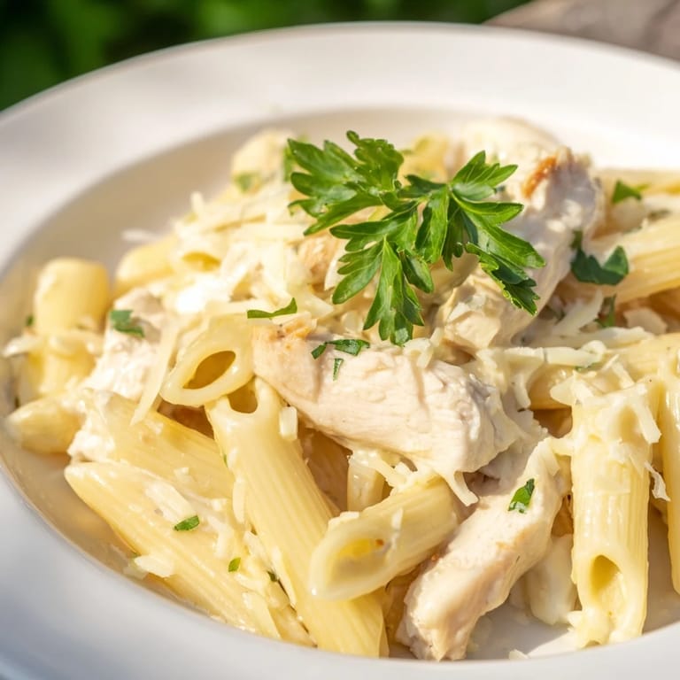 - Toss your sliced chicken and cooked penne into the sauce, adding pasta water as needed until everything is beautifully coated.